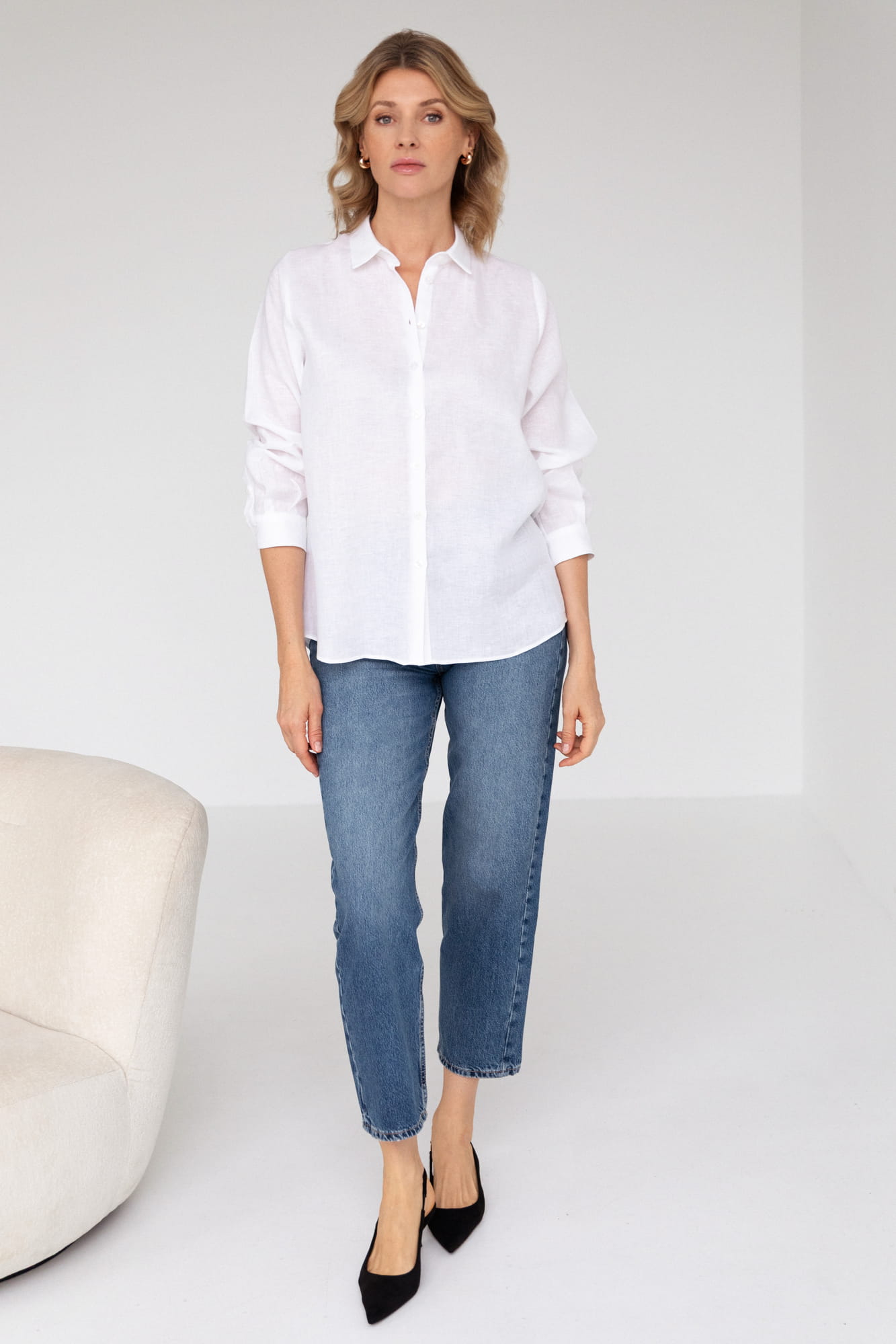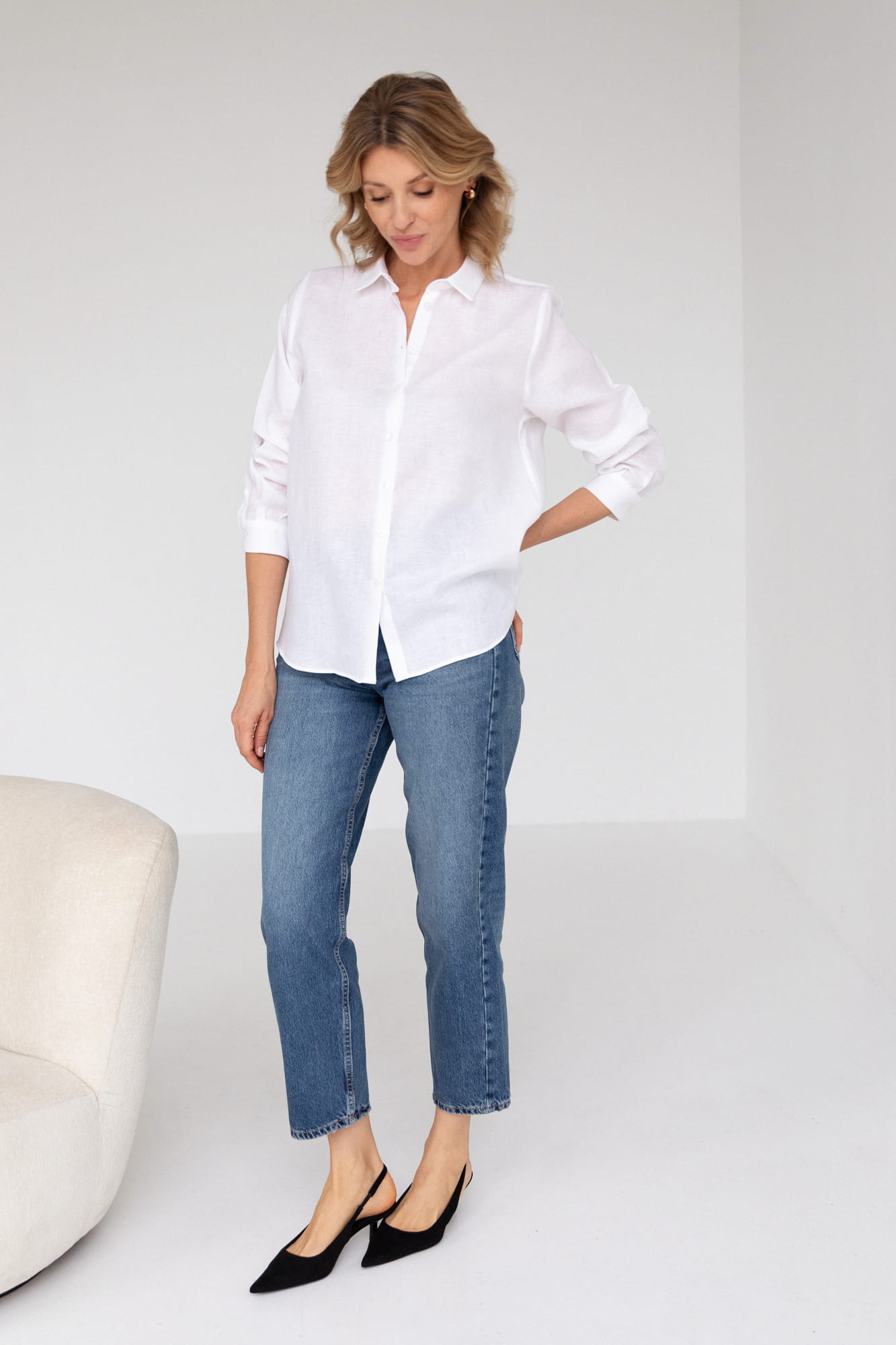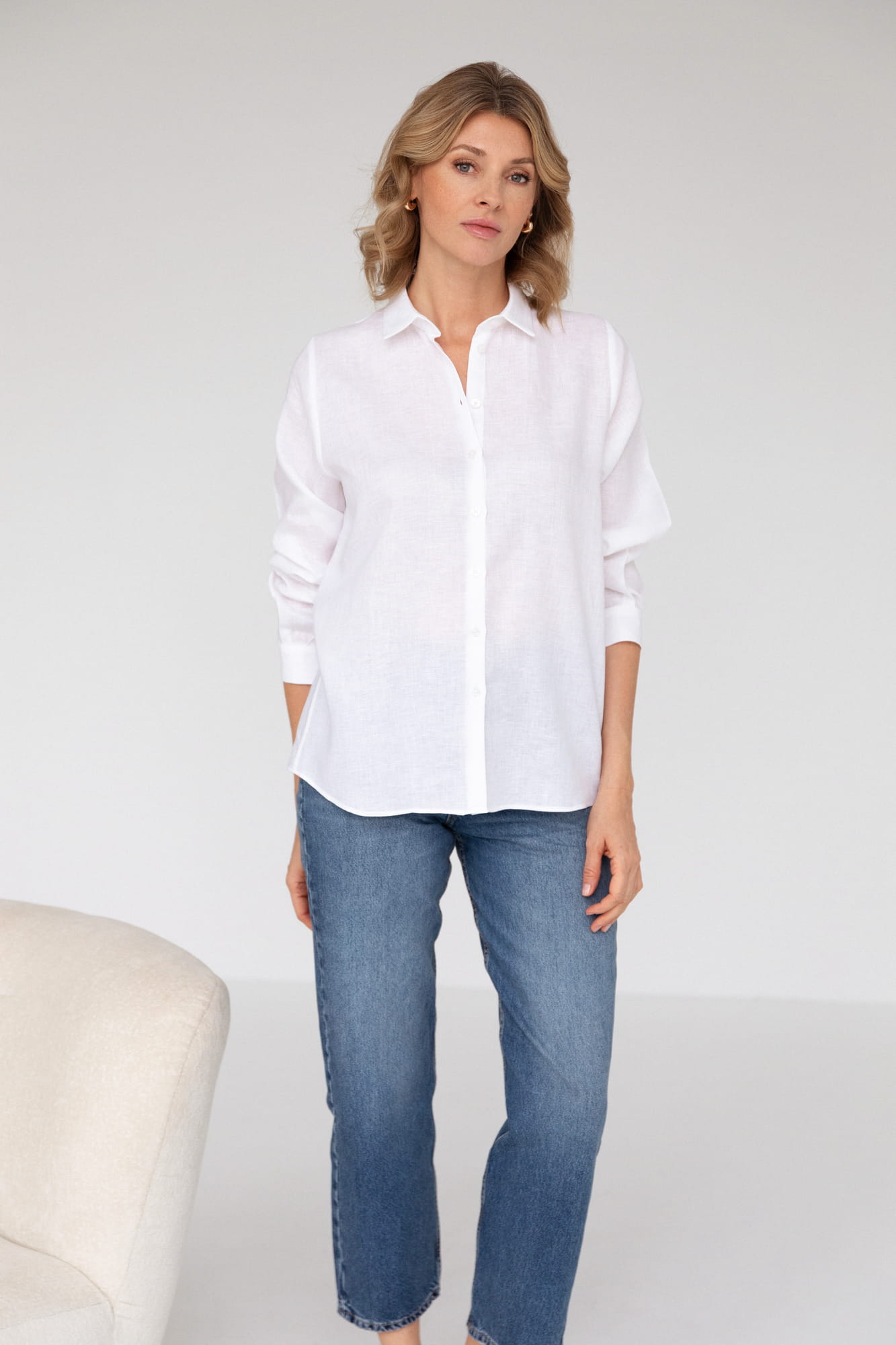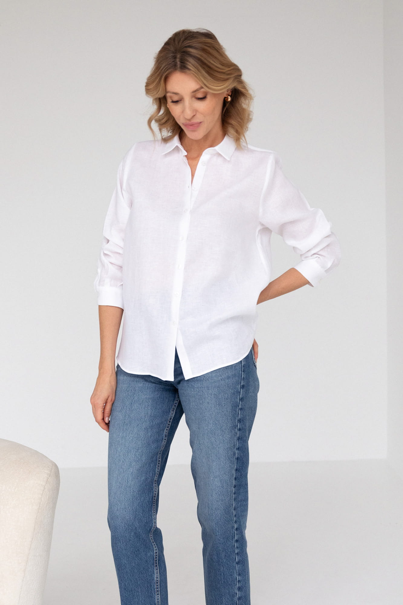 Luźna biała koszula uszyta z lekkiego czystego lnu o miękkim i wygodnym splocie. Len jest idealnym materiałem do noszenia dzięki swojej przewiewności i naturalności. Lniana koszula to absolutny klasyk i "must have" dla każdej kobiety, która ceni klasyczną elegancję z nutą sportowego charakteru. Doskonała na wszelkich wyjazdach, oraz w mieście. Podczas urlopu będzie najlepszym towarzyszem stroju kąpielowego za każdym razem gdy będziecie chciały schronić się przed słońcem lub morską bryzą, a w mieście połączycie ją z ulubionymi dżinsami, eleganckim paskiem i połyskującą biżuterią. Biała lniana koszula to wybór, który pasuje zawsze i każdemu i niezmiennie jest klasą samą w sobie.