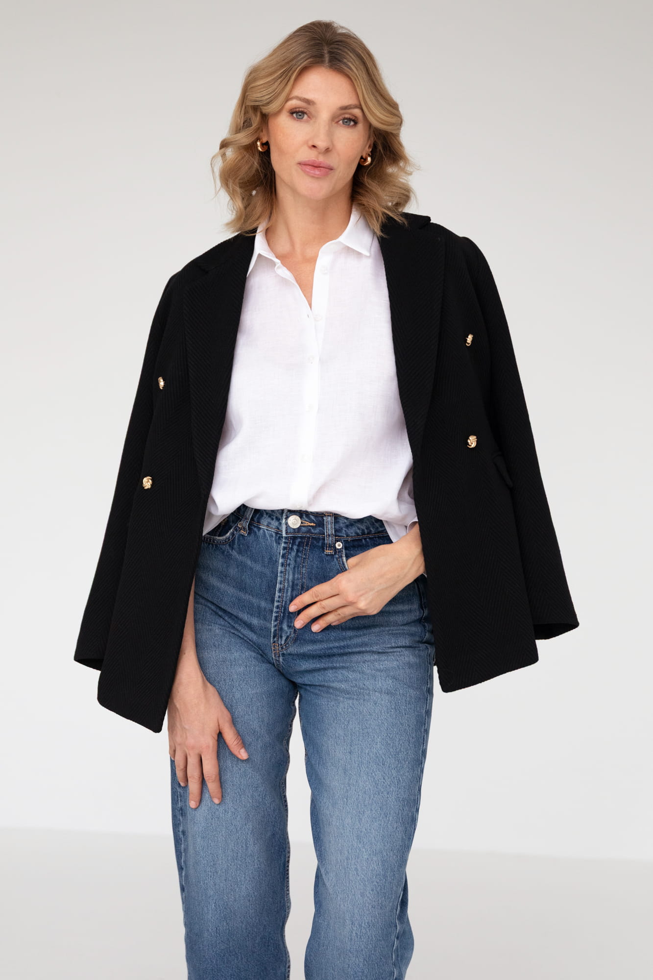 Tkanina o nieco cieńszej niż standardowa grubości tkaniny koszulowej, 120 g, lekko otulająca ciało, nieprzezroczysta. Sprawdzi się przez cały rok.