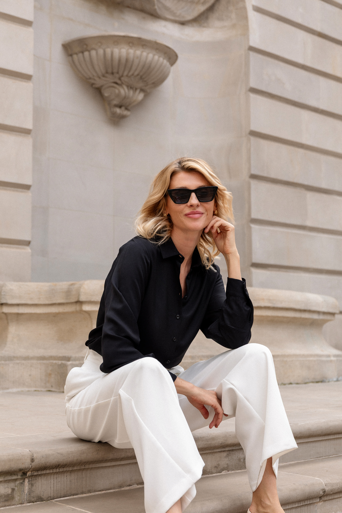 Koszula o prostej linii, bez taliowania, z delikatnie poszerzonymi i swobodnymi rękawami oraz kontrafałdą na plecach dodającą jeszcze więcej swobody. Tył koszuli nieco dłuższy od przodu. Kołnierzyk i mankiety o delikatnym, drobnym wyglądzie, pozwalające swobodnie się stylizować. Guziki w kolorze tkaniny sygnowane nazwą marki, wyprodukowane we Włoszech. Idealna do noszenia do wewnątrz do spodni i spódnic ze średnim i wyższym stanem, oraz na wierzch. Świetnie wygląda z rękawami podwiniętymi do długości 3/4, a mankiet z podwójnym zapięciem guzika umożliwia podpięcie rękawów do wersji krótkiej. Koszula powstała w ramach limitowanej linii, w której ilość uszytych koszul nie przekracza 100 szt.