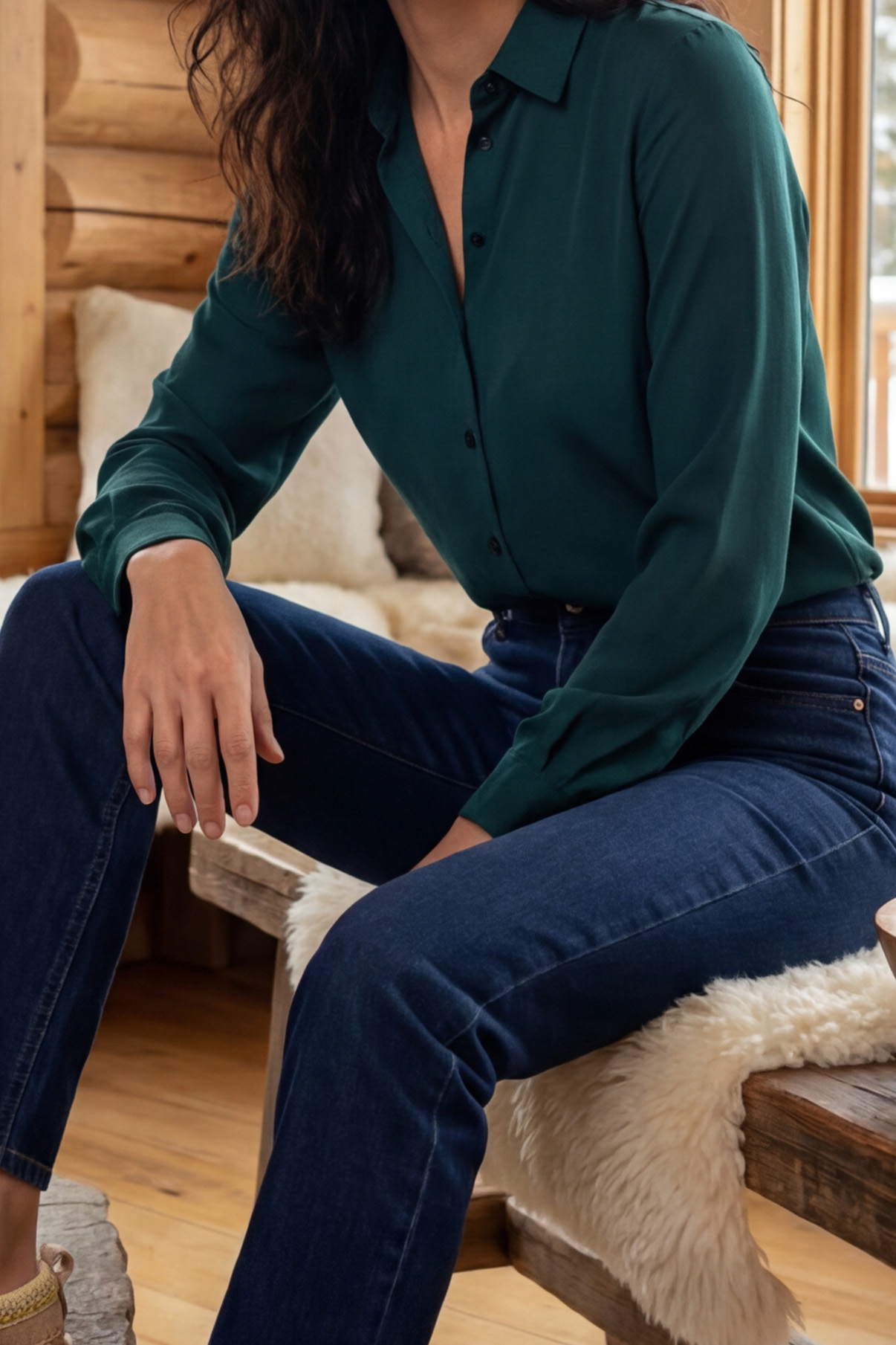 Przepiękna koszula w kolorze ciemnej szmaragdowej zieleni, uszyta w swobodnej, wygodnej linii z tkaniny miękko otulającej ciało. W towarzystwie czarnych spodni lub spódnicy stworzy idealny zestaw także na ważne spotkania, a połączona z granatowymi lub jasnymi dżinsami będzie wygodnym wyborem na co dzień.